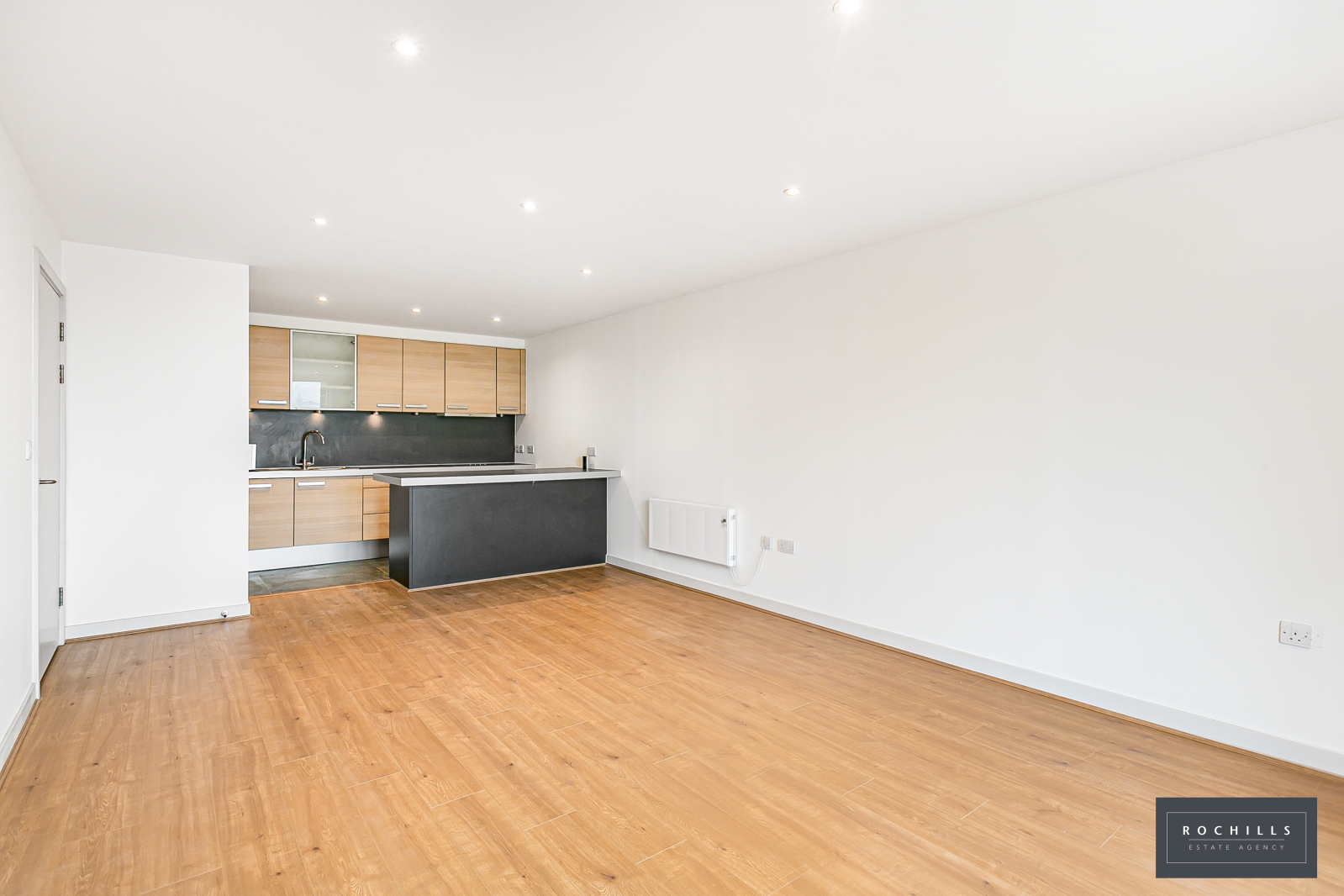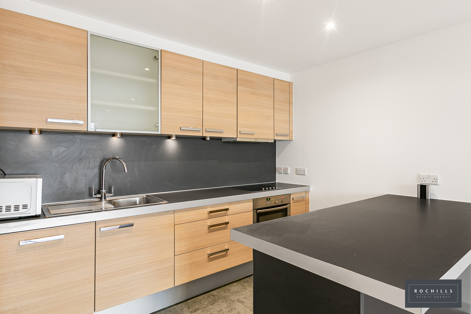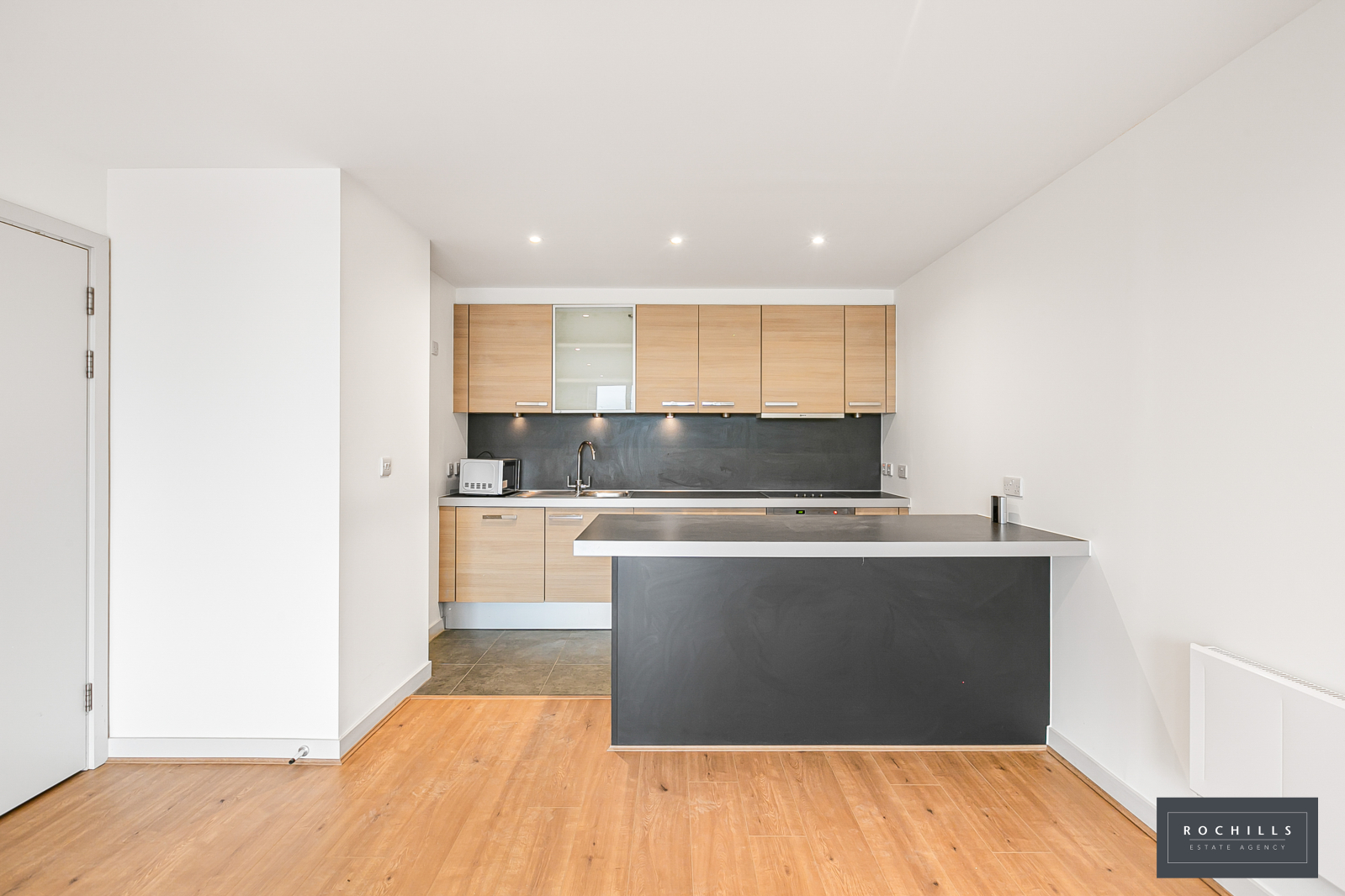 The apartment is contemporary with a front aspect living room with open plan kitchen. The living room has patio doors opening to the private balcony, whilst the kitchen area features base and eye cupboards and matching drawers, incorporating various integrated appliances.