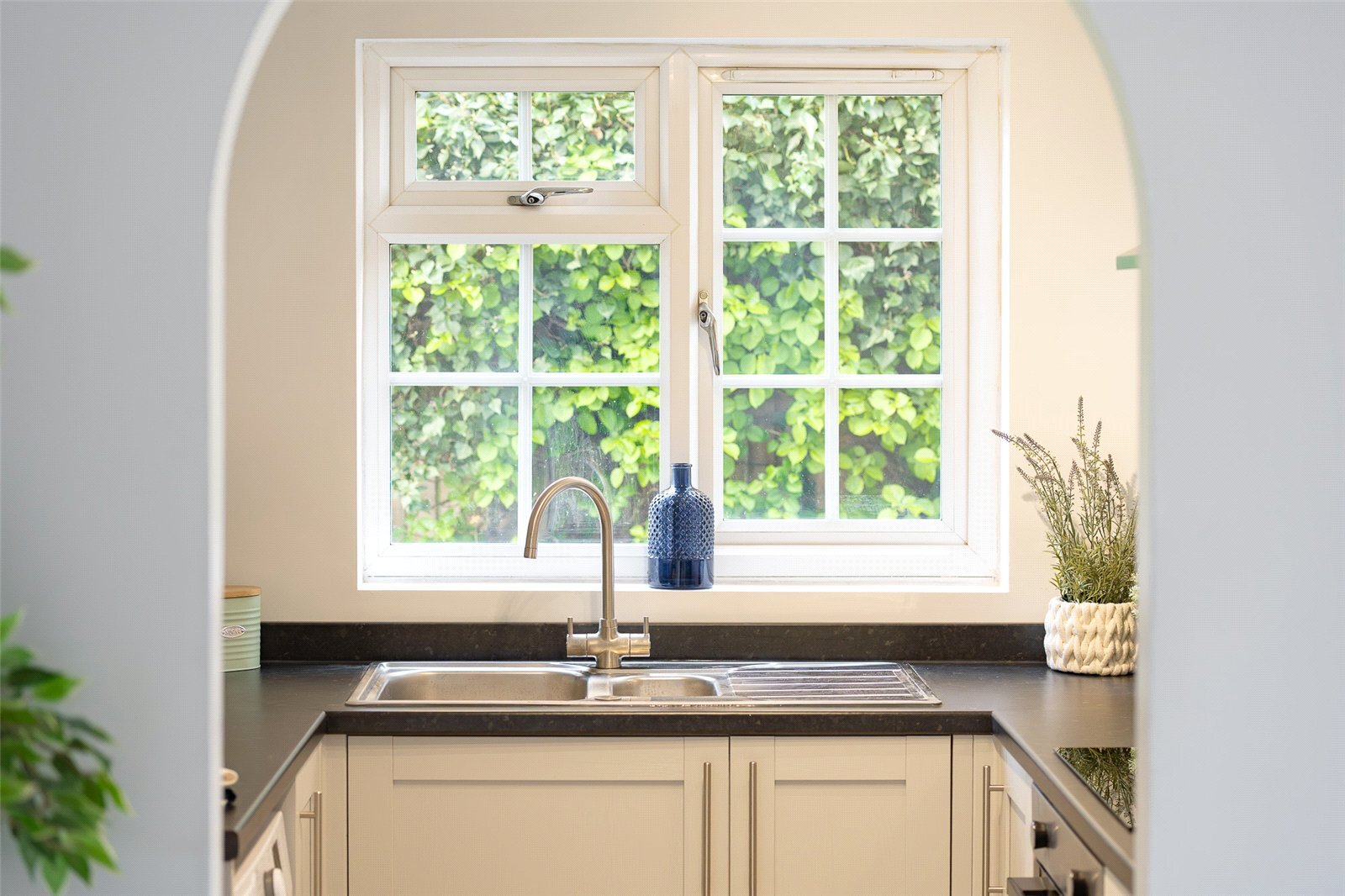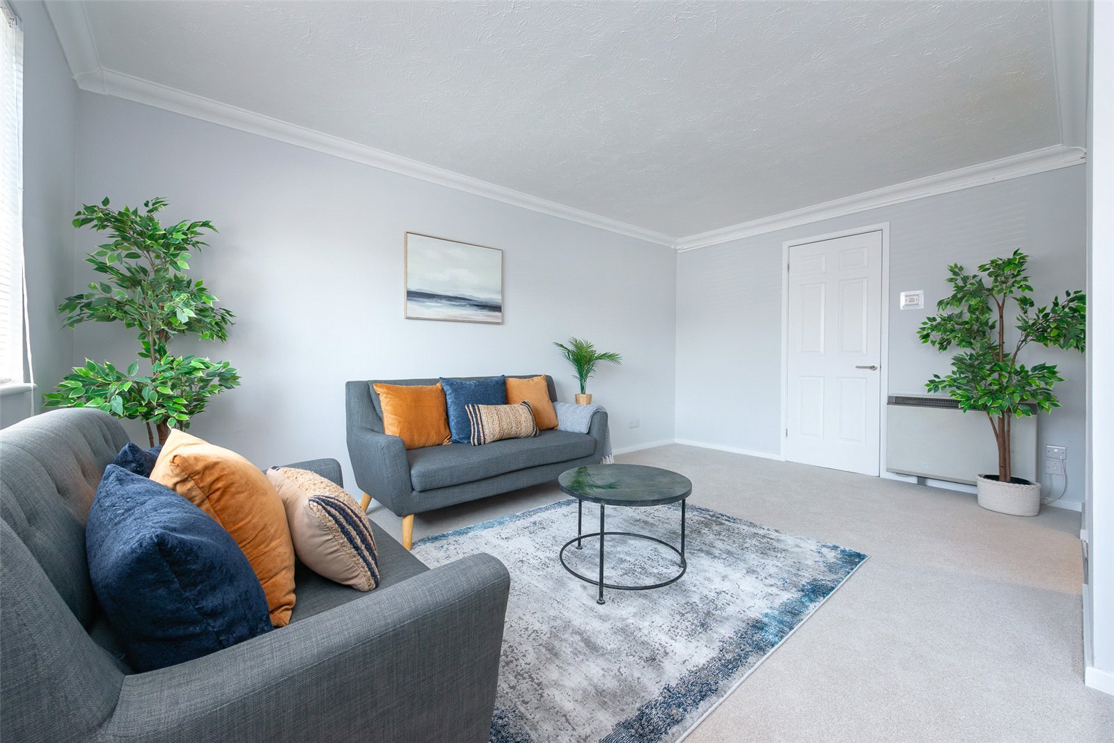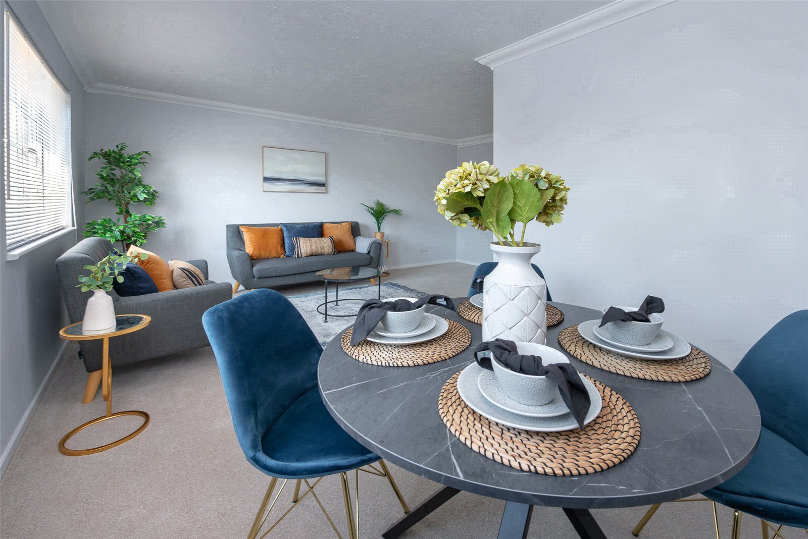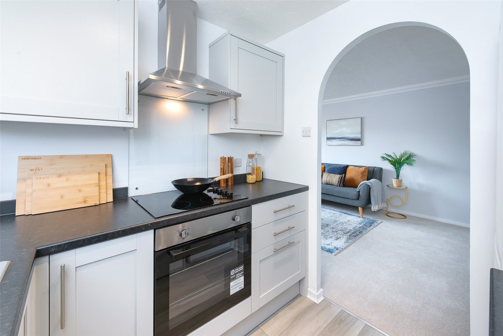 The property features a bright and generous open-plan living room, providing ample space for both relaxing and dining. A cleverly tucked-away kitchen sits just off the main living area, thoughtfully designed to maximise space while maintaining a clean and contemporary feel.