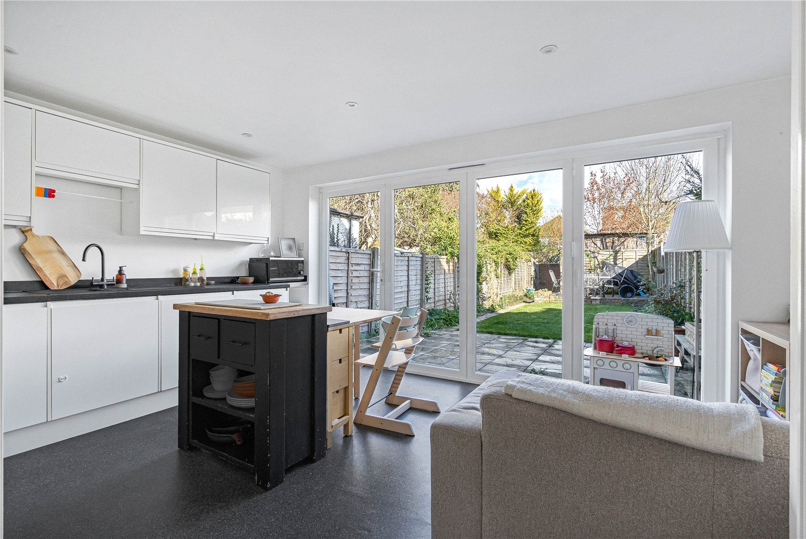 To the rear is a generous fully fitted kitchen/dining room, complete with bifold doors that create a seamless connection to the wellmaintained garden. Additional storage can be found under the stairs.